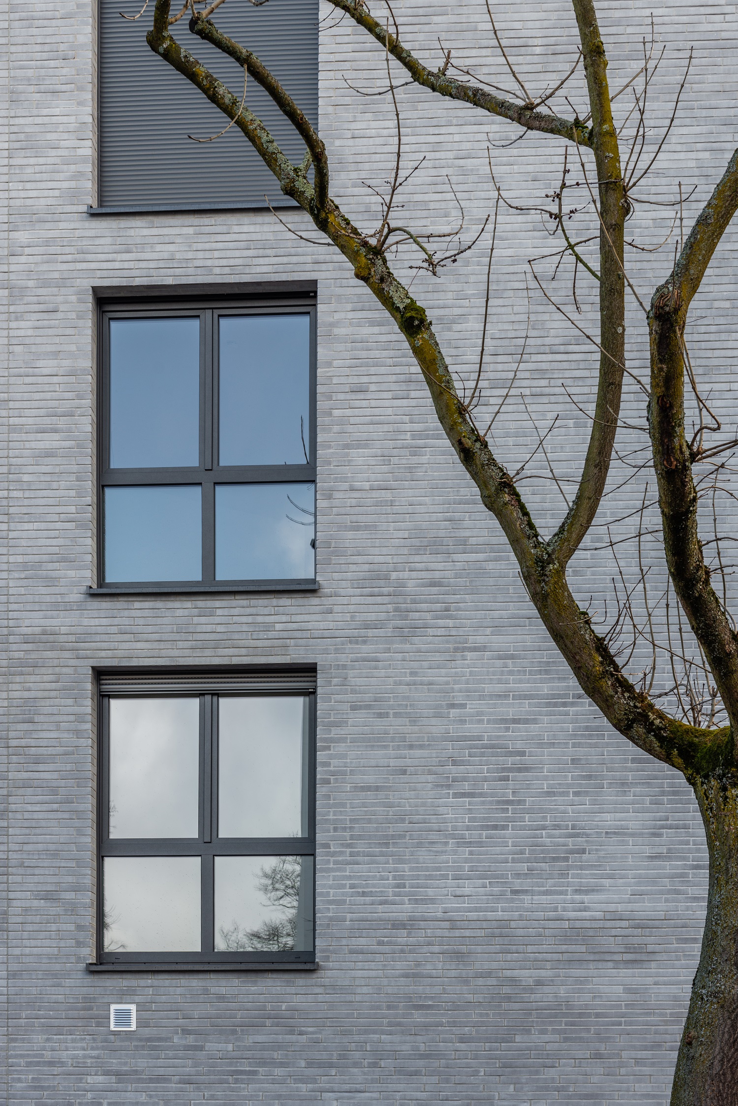 Der monolithische Baukörper nimmt die bestehenden städtebaulichen Fluchten der umliegenden Bebauung auf, insbesondere mit dem bestehenden sternförmigen Wohnhaus. Sie bilden so eine selbstverständliche Einheit. Durch die Anordnung der beiden Häuser ist ein Gartenbereich für alle Bewohner entstanden.