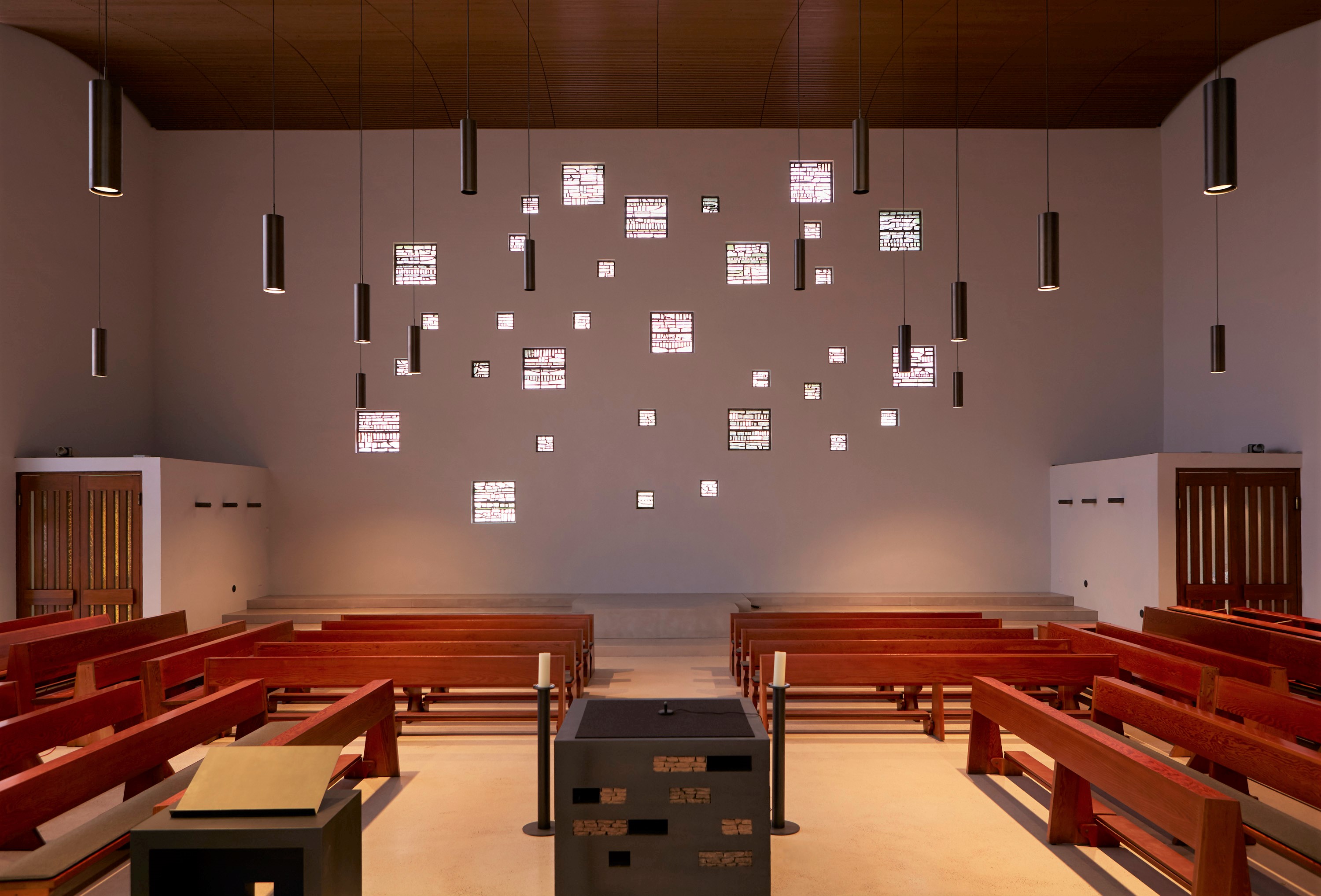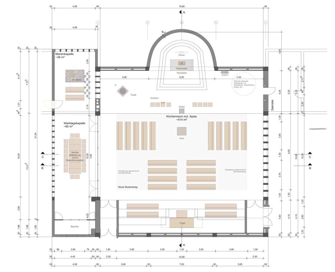 Der Grundriss wurde so organisiert, dass der Altar im Zentrum der Gemeinde steht.