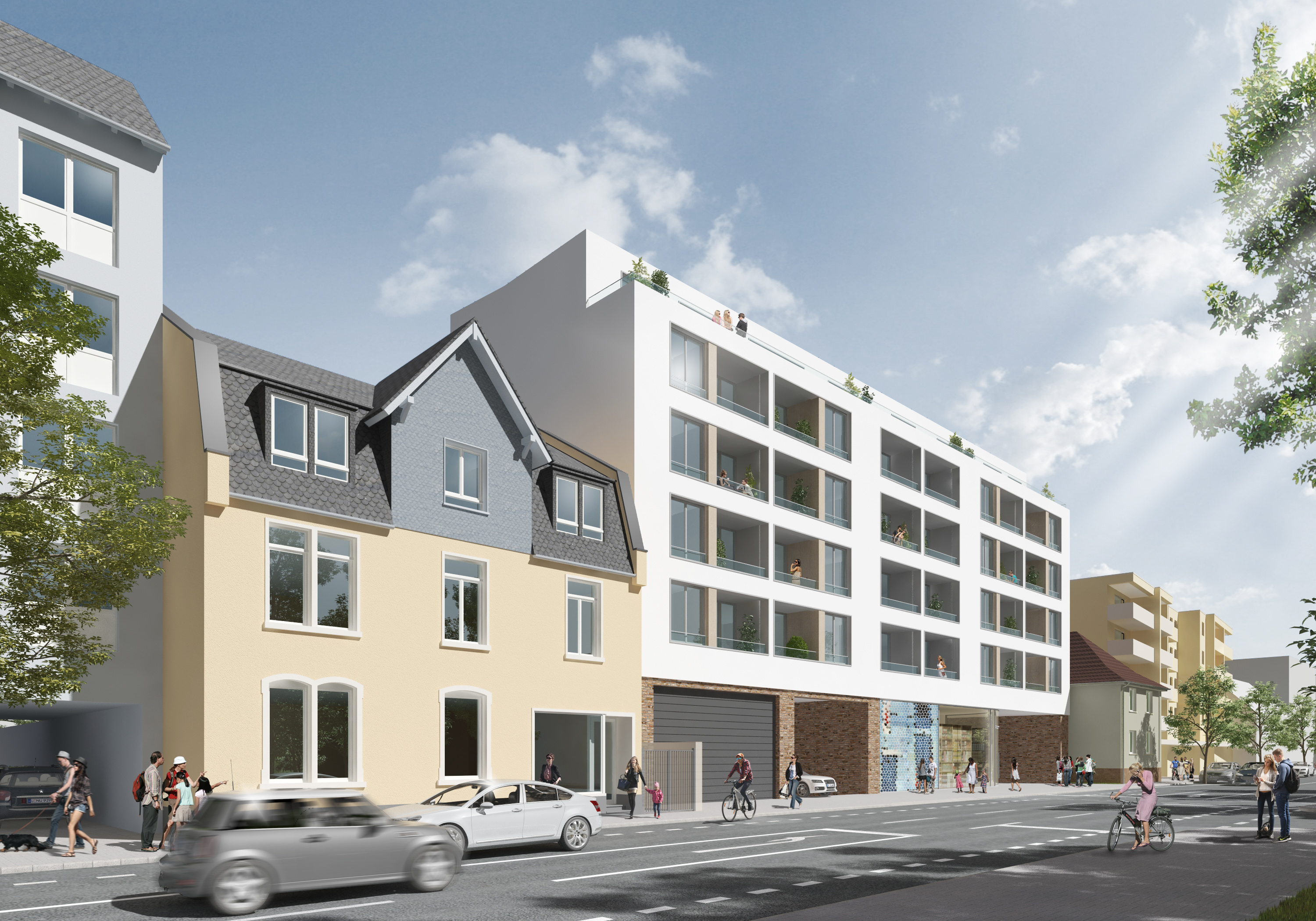 Der Entwurf nimmt die heterogenen Strukturen der Umgebung auf und fasst so die geplanten Nutzungen Wohnen und Einzelhandel im Planungsgebiet zusammen.