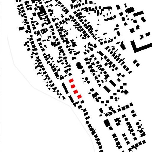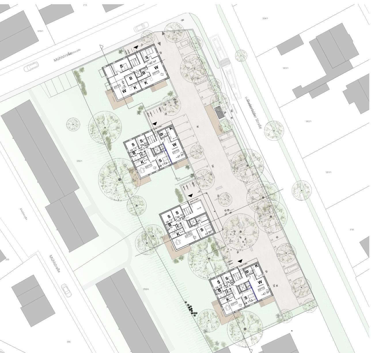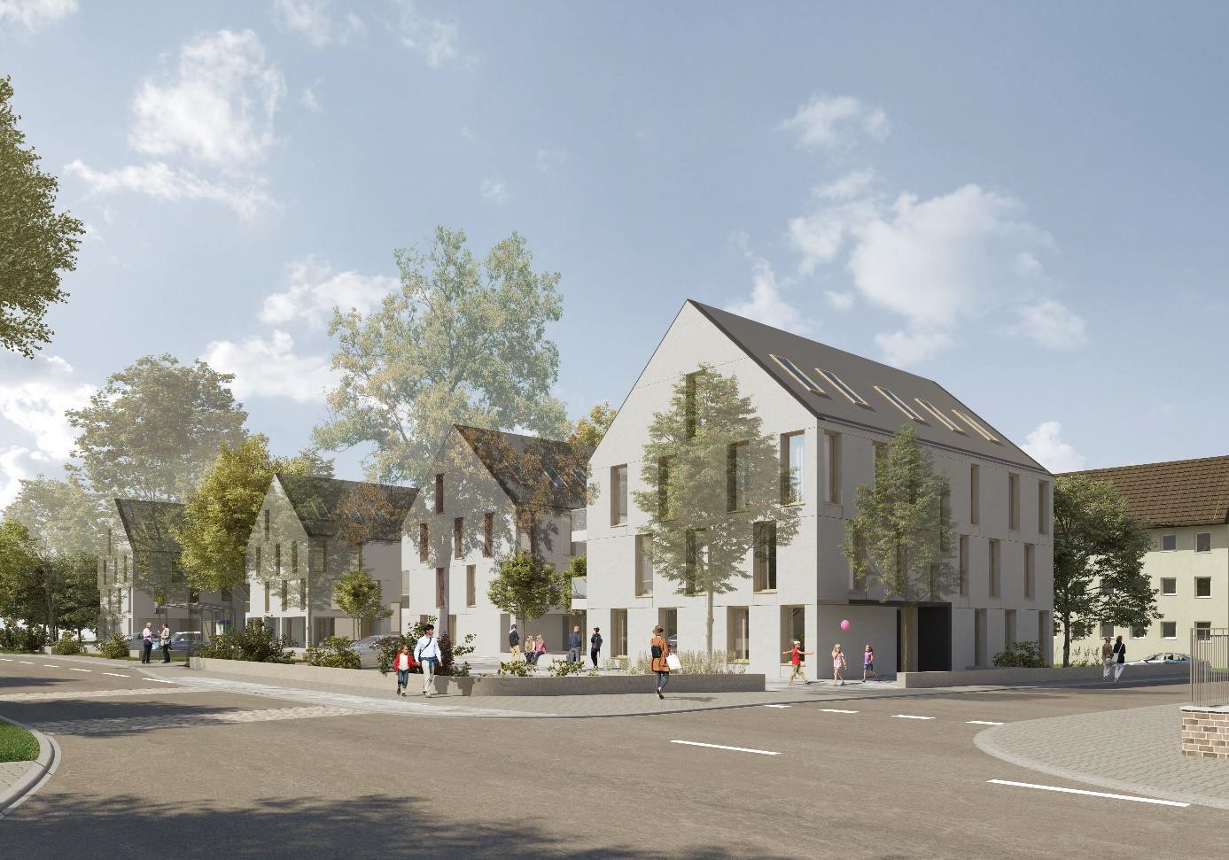 Vier nahezu gleich große Satteldachhäuser bilden mit der Nachbarbebauung die charakteristische Straßensilhouette entlang der Dudenhöfer Straße. Im Wettbewerbsgebiet bildet sich aus den Vor –und Rücksprüngen eine Gemeinschaftsfläche vor den neuen Häusern entlang der Dudenhöfer Straße und ein Platz im Quartier. Auf der straßenabgewandten Seite der vier Häuser entsteht ein privater Grünbereich, die Gärten.